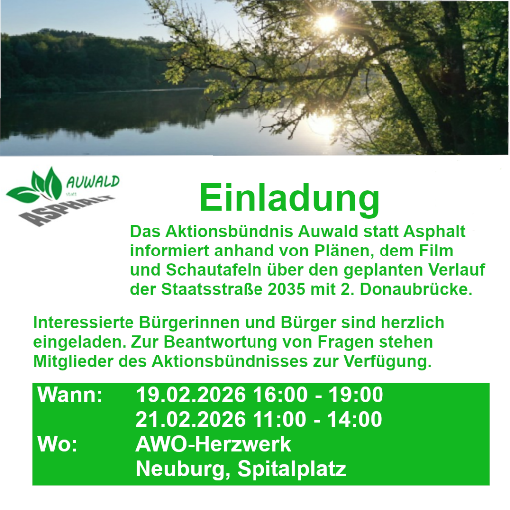 Die Donauauen vor der Haustür der Neuburgerinnen und Neuburger sind einzigartig. Ihre Bedeutung kann nicht hoch genug eingeschätzt werden. Auwälder gehören zu den artenreichsten Ökosystemen der Erde. Sie bieten Rückzugsorte für zahlreiche gefährdete Tier- und Pflanzenarten und dienen darüber hinaus der natürlichen Speicherung klimarelevanter Treibhausgase. Viele Flussauen in Deutschland sind in einem kritischen Zustand. Ihr Erhalt und konsequentes Handeln für die Auenlandschaften ist einer der Indikatoren zur Erfolgskontrolle der Nationalen Strategie zur Biologischen Vielfalt. Die Neuburger Donauauen gehören zu einem europarechtlich geschützten Biotopverbundsystem. Eine zweite Donaubrücke zerstört den Lebensraum an dieser Stelle, der für Tiere und Pflanzen, für die biologische Vielfalt und die Zukunft der Menschen von unschätzbarem Wert ist.